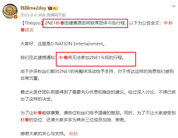 遗憾的是,一个月后,公司宣布朴春姐姐因健康问题缺席后续的2NE1行程。