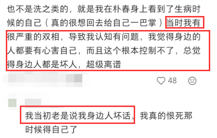 有网友分享自己患严重双相的经历,称当时的她和朴春姐姐很像,认知出问题,总觉得有人要害自己,根本控制不住,也老说身边人坏话,好了之后真的很恨那时候的自己。