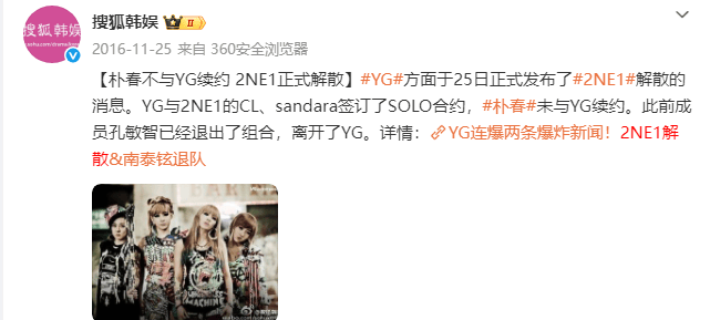 2016年11月25日,因为朴春没和YG续约,2NE1正式宣布解散。(朴春之前孔敏智已退出组合)