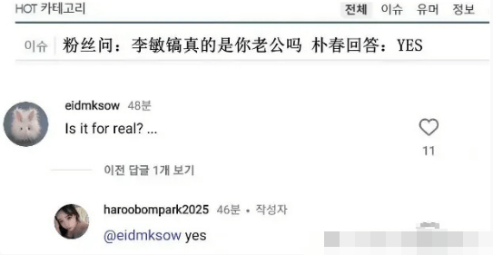 2025年2月,朴春又说自己老公是『李敏镐』,几天后还补充说:朴春『李敏镐』恋爱是真的。