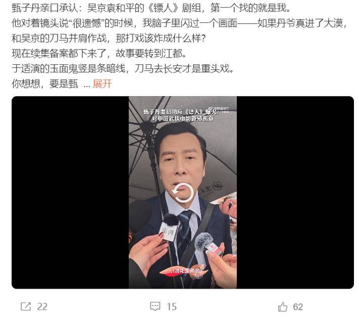 甄子丹的资历是在『吴京』之上的,似乎『李连杰』还差了半代,如果他来出演,那么《镖人》就可以说,集齐五代最能打的演员了。近日,网上出现甄子丹接受采访的事情,并回应为何没有出演《镖人》的原因。