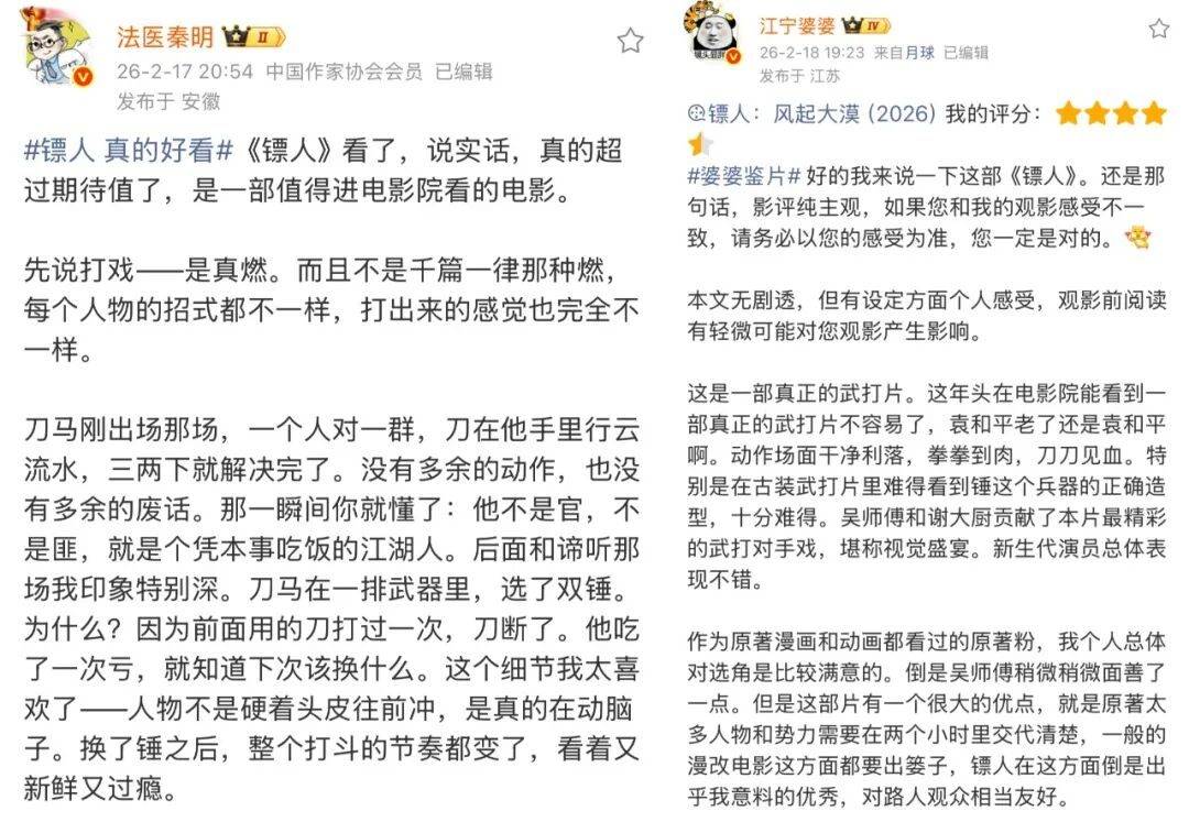 一部优秀作品,通常具备视听娱乐、人文深度等多元解读空间。事实上,除了多个热梗产出,更有多位大V化身为《镖人》自来水,通过长影评挖掘影片细节、女性♀️塑造、群像呈现、武侠美学。如@六神磊磊 发长博文表示,这是一部下了笨功夫的,扎扎实实的,有情怀和善意的武打片,十年之内,口碑还会上升。这些声音吸引了不少武侠爱好者和影迷入场。