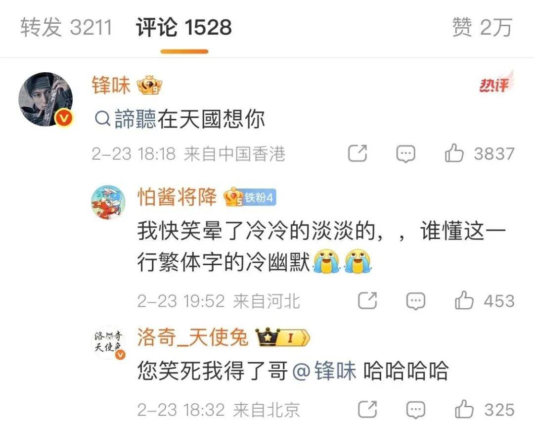 西安大雪,『吴京』一句“我在长安很想你”,『谢霆锋』回复“谛听在天国想你”,地狱笑话直击“刀马谛听”CP爱恨交织的虐感,让粉丝纷纷大呼“嗑到了”。