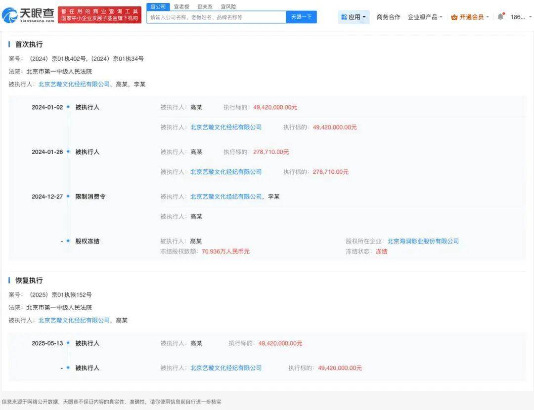 此外,『董璇』名下北京艺璇文化经纪有限公司现存一则恢复执行信息,执行标的4942万元,执行法院为北京市第一中级人民法院,涉及浙江唐德影视股份有限公司与北京艺璇文化经纪有限公司、高云翔相关演出合同纠纷案件。