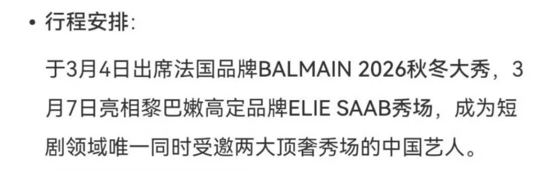 3月初,岳雨婷团队官宣,她是短剧圈首位获邀艺人,将出席 BALMAIN(3.4)、ELIE SAAB(3.7) 两场顶奢大秀,机场穿 BALMAIN 单品拍出发图,话题上热搜。