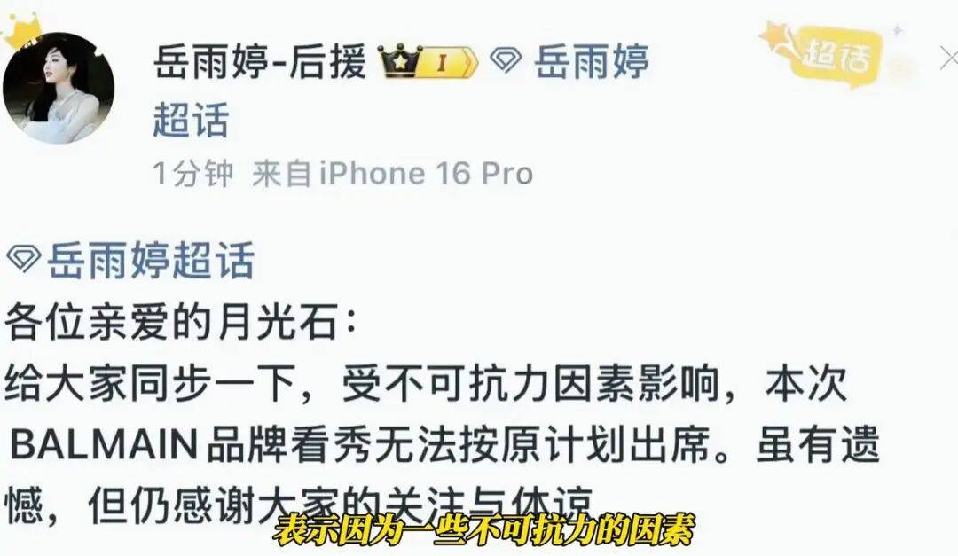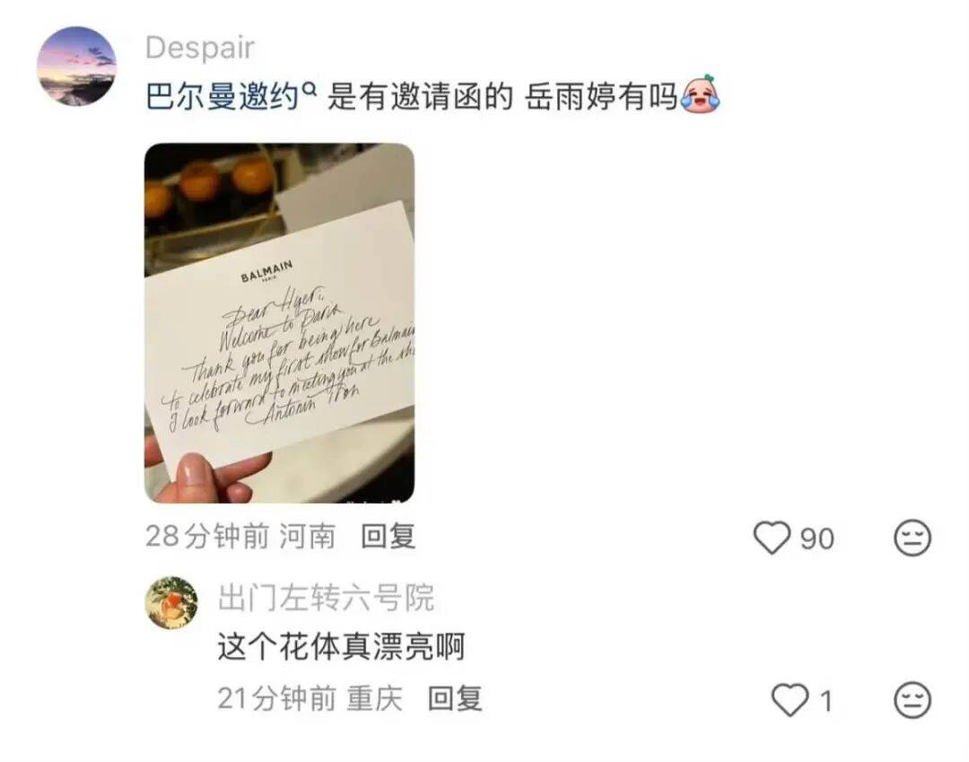 毕竟顶流『奢侈品』的品牌(如 BALMAIN)的正式邀请,标配是出发造型认领、邀请函公示、秀场专属座位、社媒互动。岳雨婷一项都没有,品牌方完全 “查无此人”。