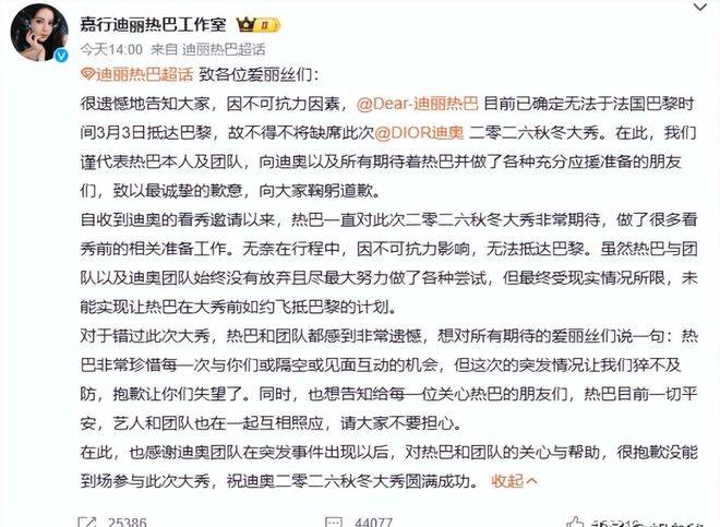 这一困就是超过二十四小时。巴黎时间的大秀准时开场,而她却远在迪拜,无法参会。原本期盼的独立工作室首秀,硬生生被演绎成一场闹剧。直到3月3日下午,嘉行才发声明,只简简单单说因不可抗力无法抵达,热巴平安无事,并感谢『迪奥』的关心。至于为何单独安排艺人走中转,为何无视安全预警,为何滞留三天才公布消息,这些关键问题,嘉行一句话都没交代。网友们不买账,完全可以理解。大家扒来扒去,总结出了团队三大明显失职,每一条都令人气愤。第一,风险预判彻底失效——明知中东局势紧张,却偏要选择高危航线,出了事连备选方案都没有,只能原地干等。换任何用心团队都做不到这种操作,让人浮想联翩。