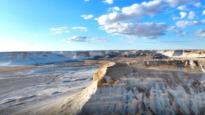 阿克套,这个名字在哈萨克语中意味着白山,白垩纪岩壁如刀锋般切割出大地的天际线。这里,里海的蔚蓝与沙漠的苍茫在天地之间无声拥抱。它不仅是里海之滨的璀璨明珠,更像一本摊开在欧亚大陆上的地质与历史的教科书,记录着无数的变迁与传奇。在这里,歌手们面临两张明信片般的选择——一张是里海里的烟火叙事,另一张则是峡谷与风的对话。这些明信片勾画出了阿克套的两种截然不同的面貌。一组歌手被里海的浪漫所吸引,渴望在海风中拾起那些尘封的记忆;另一组则被峡谷的雄浑景色深深震撼,期望在古老岩层间聆听时间的回响。这样的选择,注定了他们将解锁这座城市的两种独特面向。