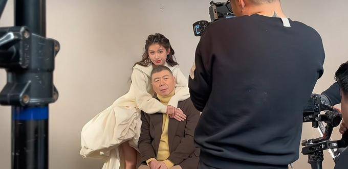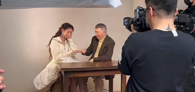 徐朵和她的爸爸开始了正式的拍摄,他们化妆并换上了新衣服,给人一种拍摄的感觉。摄影师可能是在一个轻松的环境中,让父亲和女儿玩些小游戏来拍照,他们之间的互动非常自然,表现也非常亲密。