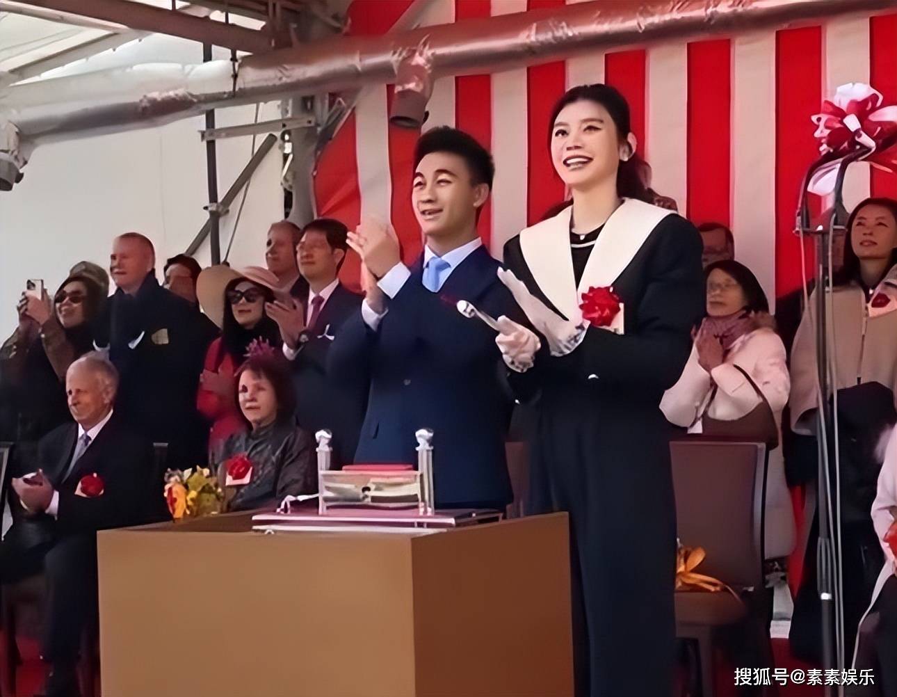 当时奚梦瑶和何猷君夫妻合体一起给新船办下水礼,婆婆梁安琪坐在身后灿笑,小姑子何超欣全家出动,共同见证这一幸福时刻。