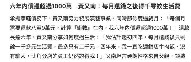 黄又南当年愿意承担父亲的债务,出于对亲情的责任感,也因为当时自己的『娱乐圈』️发展仍有无限可能,他相信只要努力,总有还清债务的机会。即便如此,偿还债务的岁月依旧异常艰苦。他坦言,每个月需要偿还八至九万元的债务,在六年间总共清偿了超过一千万元。在还债的前四年,他每月结余供自由支配的生活费仅有一千到两千元,那四年里,他几乎每天只吃快餐连锁店的牛肉饭,以至于分店的店员都能认出他。