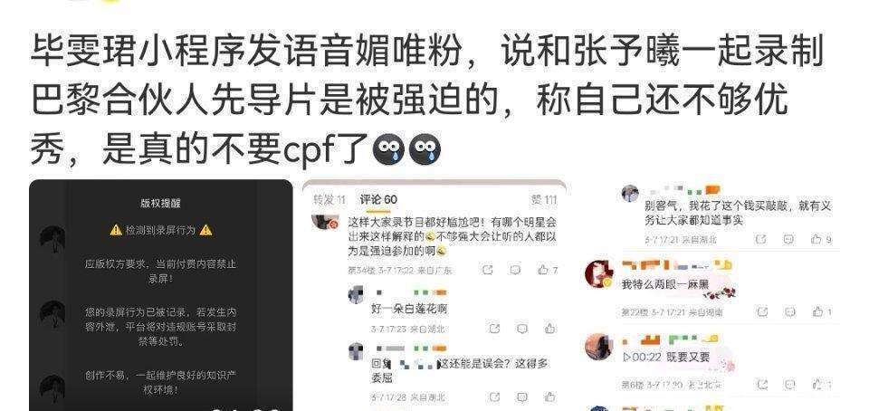 随后,毕雯珺在付费粉丝群内发语音解释,称录制安排比较临时,节目组专门到剧组沟通,经公司确认才同意参与。他提到工作中存在不可控情况,并自述可能我不够好吧?不够强大。然而,这段音频被外界广泛解读为被迫营业发卖CP粉,迅速引发了CP粉的不满和争议。
