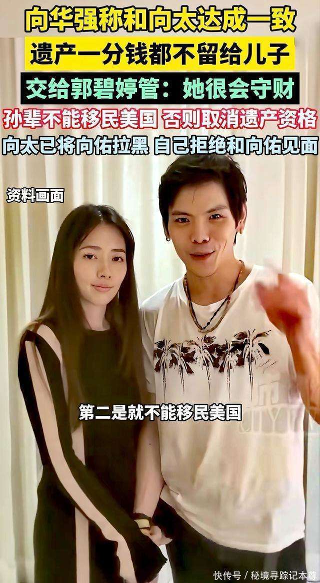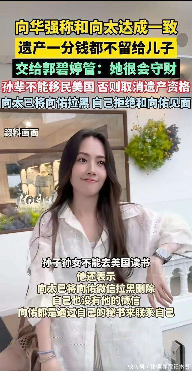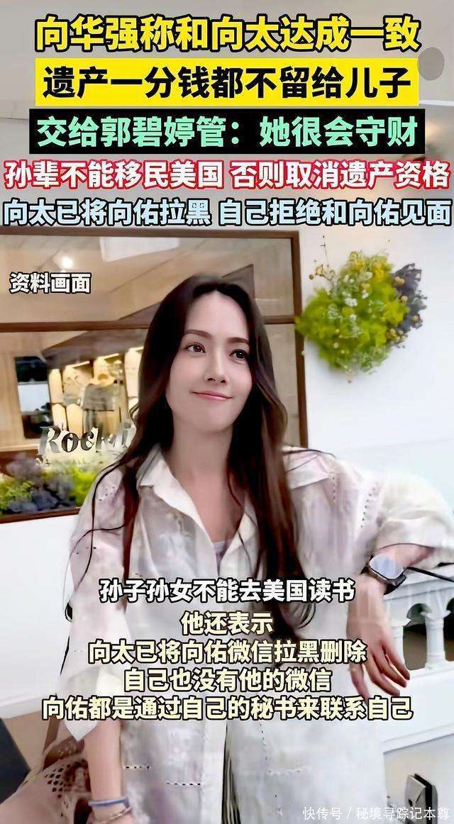 向太说得更为直白,她强调,这一切并不是看不看得起孩子,而是因为他们已经吃过亏。她提到小儿子向佑当年在国外留学时走了歪路,身在异乡,家里无法管控,导致他结交了不良的朋友,荒废学业,乱花钱。那段经历对向太而言,就像一根刺,深深扎在心里,无法拔除。 他当时一个人在那么远的地方,我们想管也管不到。眼睁睁看着他一步步走偏,我们心里那个悔啊。所以现在我们坚持,孩子必须在我们身边长大,看到他们走正道,我们才能安心。 遗嘱的事传出后,小儿子向佑立刻有了反应。听说他得知了这个消息后,电话打了一个又一个。然而,这回,向太和『向华强』都没有心软。 向太始终没有接电话,甚至后来听说,向佑托人带话想请父母一起吃饭时,他们也一句没空就拒绝了。曾经那位无条件包容儿子的母亲,这次用沉默给出了最终的答案——有些路,必须自己走。 『向华强』也在采访时表示:向太和他没有直接联系,他要找我,得先通过秘书转达。他还说:遗嘱早就立好了,但钱不能先分。原则就是让他们自己挣钱,要是想什么都不干,连每月那点生活费都不给! 这话听上去有些冷酷,但细想之下,却充满了无奈。老两口都已经快八十了,他们太明白:给儿子留下金山,远不如给孙子留个靠谱的妈妈,并加上一道不能懒散的约束。 看完这场家庭风波,我对向家深感敬佩。 我们见过许多富裕家庭为家产争得面红耳赤,像李兆基家、郭炳江兄弟,几乎每个家庭都因此闹翻。而『向华强』和向太,给了我一种不同的感觉。 乍一看,他们似乎过于冷酷,但仔细想想,这样的决定,才是真正的为人父母最难的那一步棋。 首先,他们清楚什么是疼孩子,什么是害孩子。很多父母总想着给子女积攒钱财,认为钱能改变一切,却不知道,钱往往会成为孩子的毒药。你看向太,年轻时拼命宠爱,结果最终换来的是慈母多败儿的深刻教训。而如今,明白了其中的道理,她选择了让儿子们自己去挣取,才是对他们真正的爱。 其次,他们守得住根。现如今,很多父母拼命把孩子送出国,但向家却偏偏选择另一条路。他们宁可用家族财富做赌注,也要坚持让孩子在自己身边长大。为什么?因为他们知道,若孩子离开家长的监督,就像一棵没有根的草,风一吹就倒。 再看看郭碧婷,嫁进豪门多年,始终低调踏实,不争不抢。她用自己的行动赢得了向太的信任,把孩子带在身边,生活安稳。这样稳重的媳妇,难怪老两口会把家产交给她打理。 而向佑,二十年前也曾在父母面前撒娇,而如今,却因为自己曾走的弯路,不得不接受这个沉痛的教训。一个是把财富带进家里,一个是将家庭拆得支离破碎。这一对比,立刻让人明白了其中的深意。 这场豪门风波,看似是在分家产,但骨子里却是在分家人的心。钱可以锁进信托,但品德无法托管。真正能够守住家业的,从来不是血缘,而是每个家庭成员身上的那份责任与担当。 如果你也是为人父母,或正在为孩子的教育和未来忧心,不妨把这篇文章转给孩子看看,给他们一点启发。对于向家这一决定,你又怎么看呢?