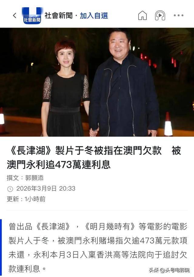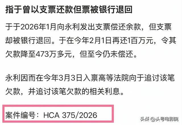 据港媒进一步披露,澳门永利渡假村(澳门)股份有限公司于2026年3月3日向香港高等法院提起诉讼,明确被告为于冬。入禀状详细说明了欠款过程:2024年5月1日,于冬向永利借款1000万港元,并约定在同月16日还款;然而到2024年11月,他仅偿还部分款项,仍欠573万余元。2026年1月,于冬尝试通过开具支票结清余款,却遭银行退票。今年2月1日,他偿还100万港元,但剩余473万至今未到账。起诉状中还强调,于冬是知名电影『制片人』,同时担任博纳影视娱乐有限公司总裁。这条消息迅速被多家媒体转载,引发舆论关注并登上热搜。