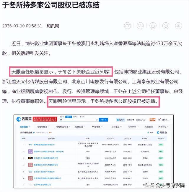 头号电影院🎦懂小姐(topcinema原创,严禁转载)消息,一时间,博纳影业董事长于冬的名字骤然蹿上热搜。港媒报道称,澳门永利赌场向香港高等法院提起诉讼,追讨于冬逾473万港元的欠款。然而,博纳影业方面最初回应称:此为不实信息,正在举报相关帖子。最新媒体报道则显示,公司目前仍在内部核查阶段,尚未给出最终结论。