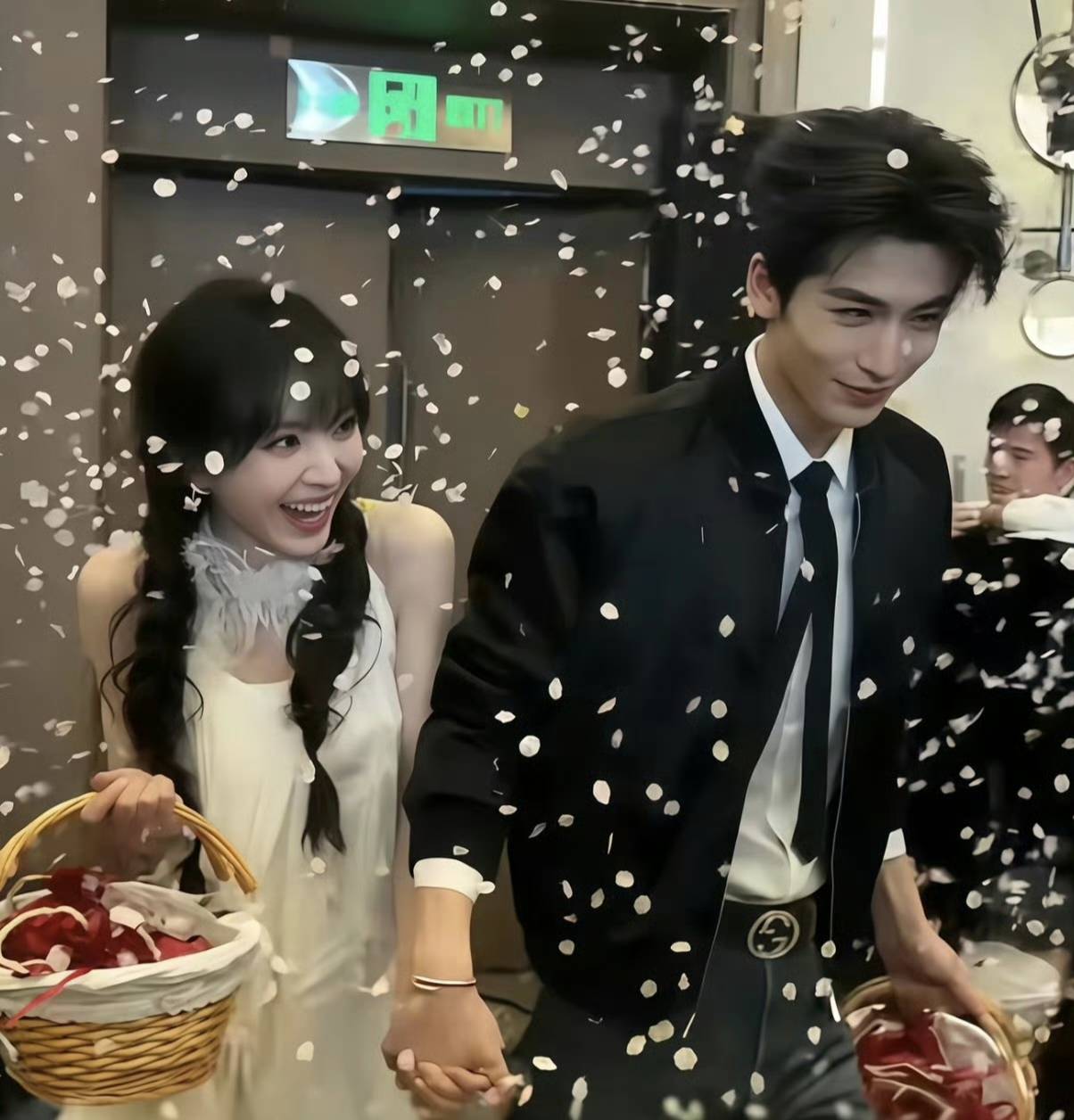 田曦薇头戴碎花王冠,披着轻盈蕾丝头纱,张凌赫一身笔挺西装,两人往那儿一站,22cm的身高差配上逆光相拥,宿命感直接拉满。网友辣评:“这哪是追剧团,这分明是婚礼现场发喜糖!”
