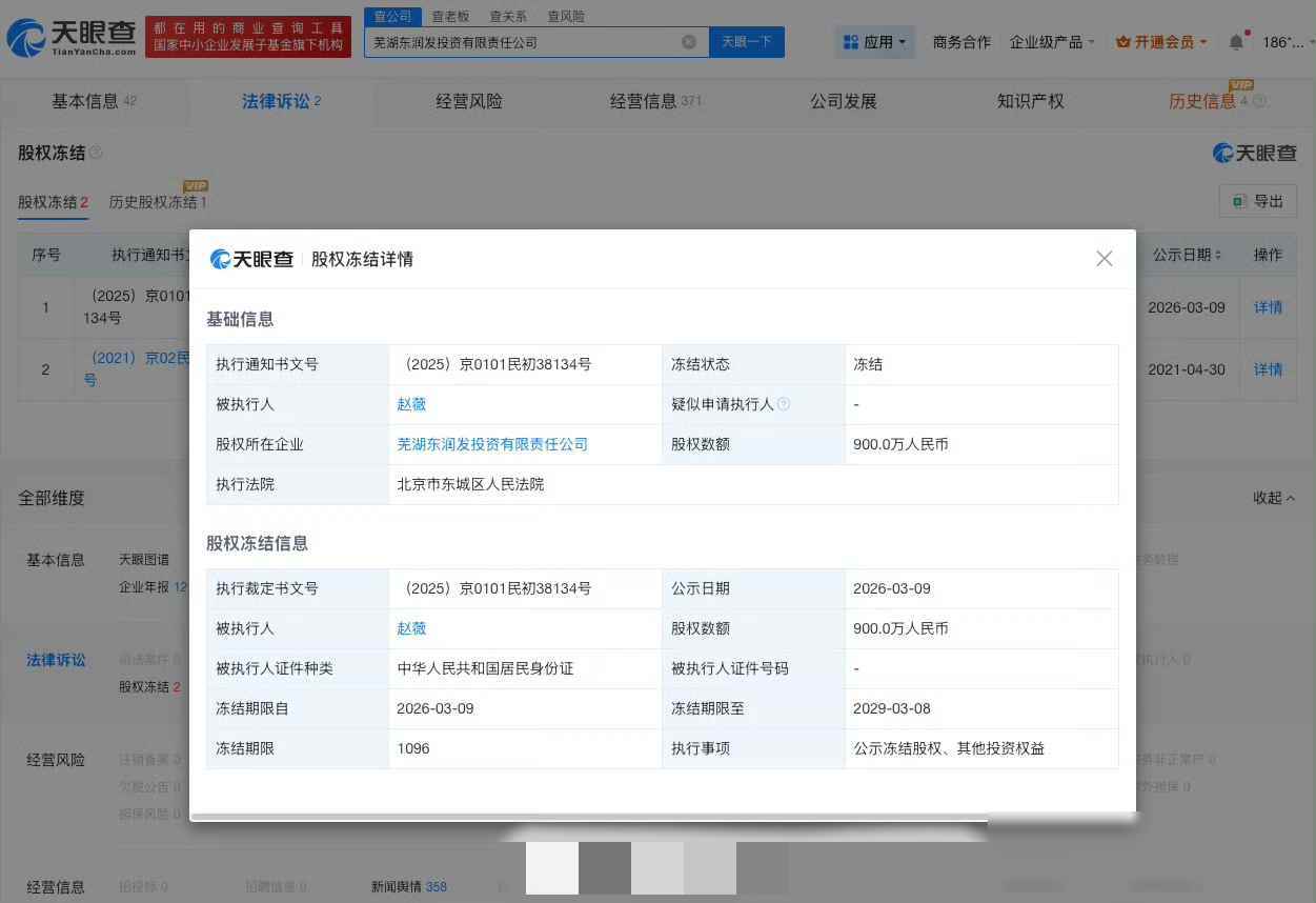 3月11号晚上,赵薇突然上了热搜,北京东城法院冻结了她在芜湖那家公司的900万股权,一直冻到2029年3月,这已经不是头一回了,也不是件小事,背后牵扯的是一条从2017年就开始的债务链,越拉越长,越缠越紧。