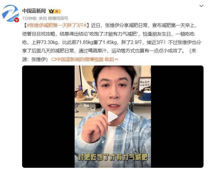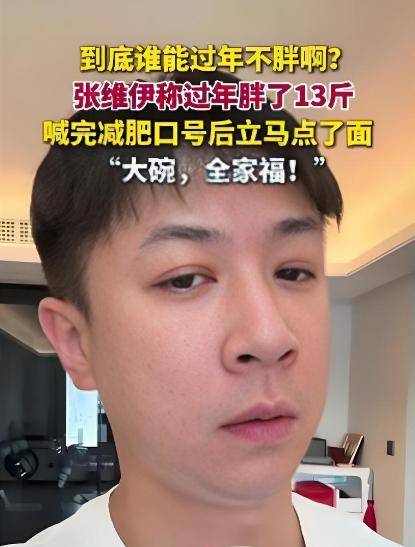 但这还不是最绝的。 时间往回倒几天,3月3号元宵节,这位哥先在『社交平台』炸了个雷:自曝过年期间体重从130斤狂飙到143.7斤,足足长了13斤多! 视频里他一脸无奈,对着体重秤感慨“出来过年迟早要还的”,还郑重宣布:“过了元宵节,明天开始减肥,目标瘦回130斤! ”话音还没落呢,画外音工作人员问:“张老师,面要小碗还是大碗? ”这位爷想都没想,脱口而出:“大碗! 全家福! ”减肥宣言和大碗点单无缝衔接,这反差名场面直接冲上热搜,张维伊喊完减肥口号立马点了大碗面,阅读量爆了。