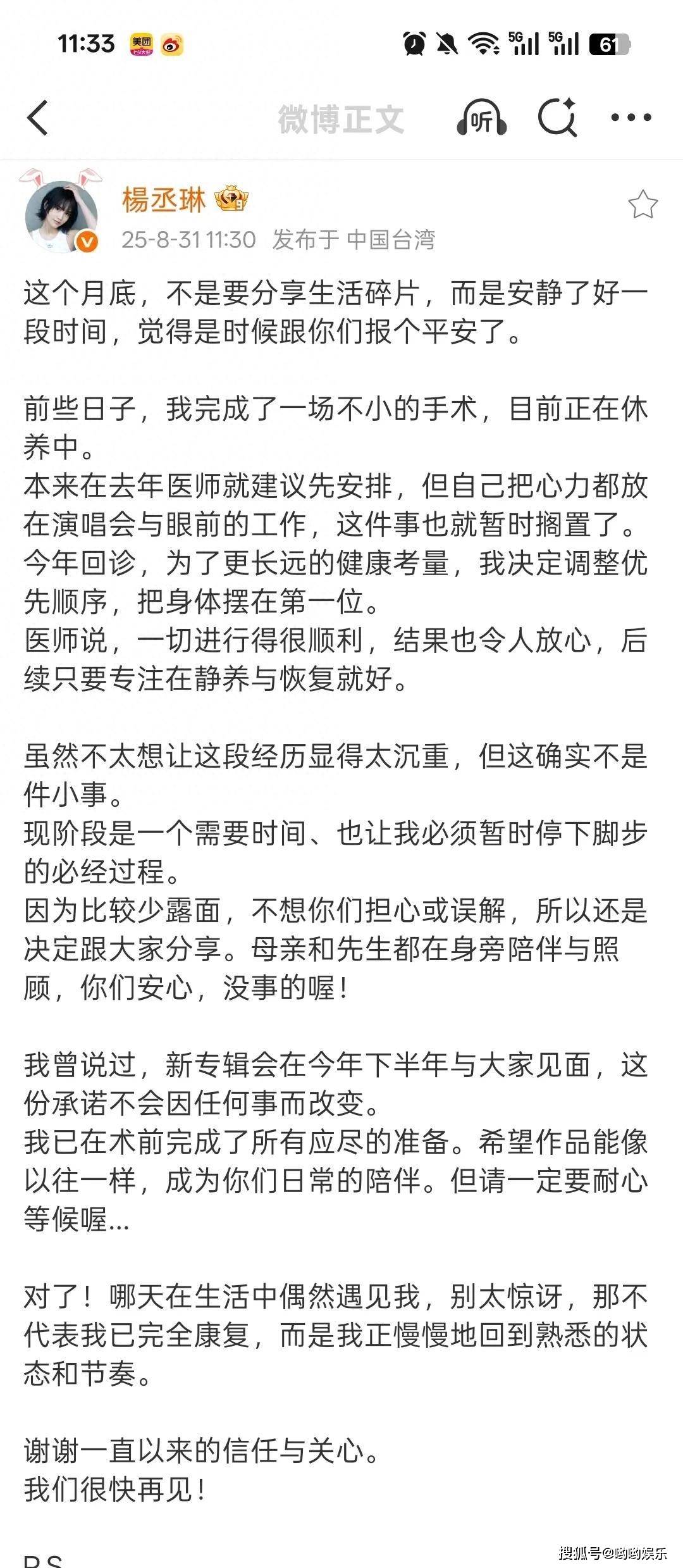 『杨丞琳』很安静地发布了一段长文,没有催人泪下的煽情句子,没有复杂的故事线,只字句平和透露她做出的决定——暂且告别。她没有用“离开”这个词渲染分离,只是讲自己想按下暂停键,从喧嚣的『娱乐圈』️抽身出来透透气。