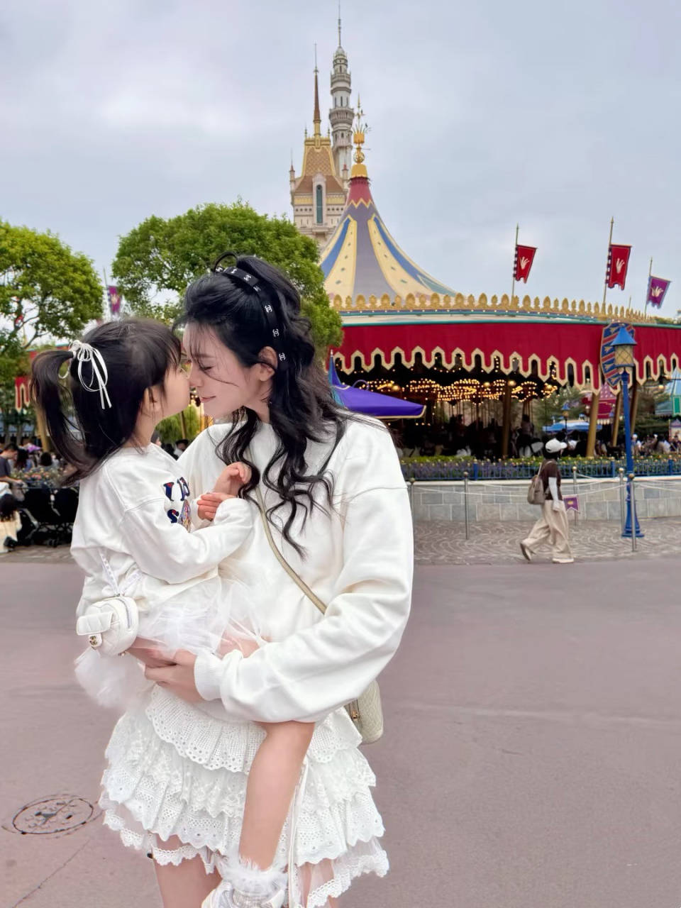 带着女儿一起逛游乐园的画面,奚梦瑶和女儿穿同款亲子装,她用鼻尖去触碰女儿的小脸,这个画面太唯美了,女儿虽然没有露正脸,但是圆润的脸庞、透亮的皮肤,就显得非常可爱。