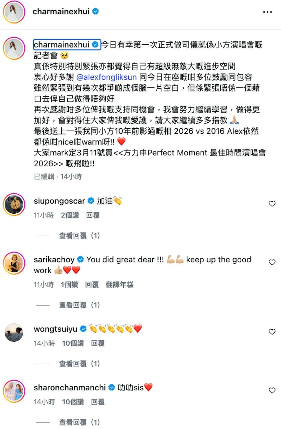 許惠菁發文抒發首次做司儀的感受,她坦言記者會主持期間,有幾次緊張到腦袋一片空白,幸而大家包容:「今日有幸第一次正式做司儀就係小方演唱會嘅記者會 真係特別特別緊張亦都覺得自己有超級無敵大嘅進步空間 衷心好多謝 @alexfongliksun 同今日在座嘅咁多位鼓勵同包容 雖然緊張到有幾次都爭啲成個腦一片空白,但係緊張唔係一個藉口去俾自己做得唔夠好 再次感謝咁多位俾我嘅支持同機會,我會努力繼續學習,做得更加好,會對得住大家俾我嘅愛護,請大家繼續多多指教」。不少藝人都留言祝許惠菁加油。