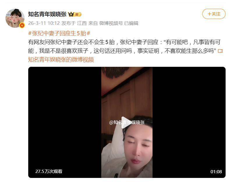 据3月11日网友爆料,74岁导演张纪中的妻子杜星霖一句轻飘飘的“有可能吧,凡事皆有可能”,直接让张纪中妻子回应生5胎冲上热搜。面对网友关于是否继续“添丁”的犀利提问,这位频繁占据育儿话题榜的女主人,用一句万能哲学句式给出了开放答案,顺便还“凡尔赛”了一把对孩子的热爱:“不喜欢能生那么多吗?”