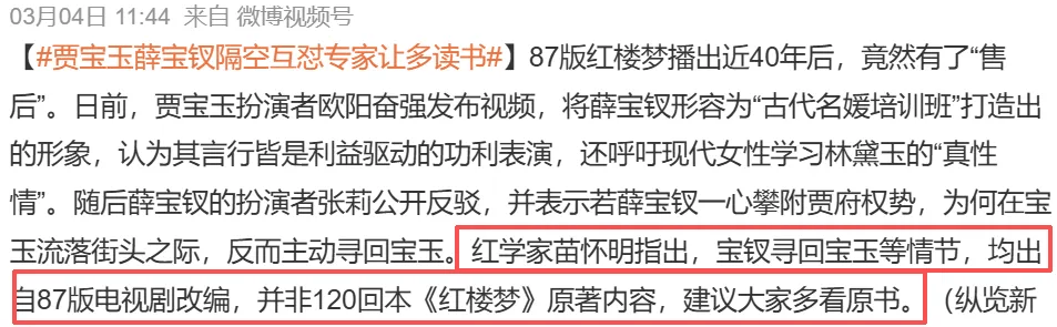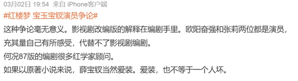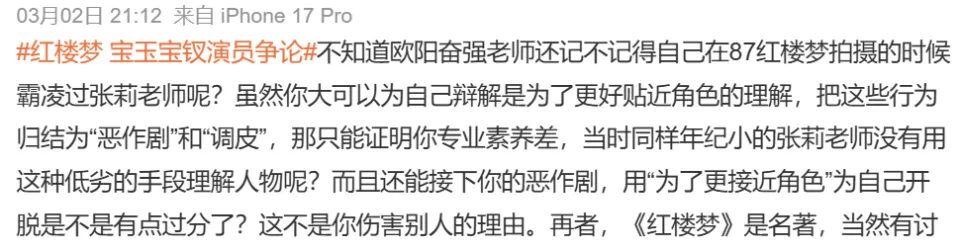 饰演贾宝玉的欧阳奋强与出演薛宝钗的张莉,隔空辩论“薛宝钗是个什么成分”,相关词条被顶上热搜。但网友发现,大家不仅没因“情怀杀”感动,反而惊叹于欧阳奋强对原著人物理解的浅薄。墙倒众人推,欧阳奋强当年在剧组涉嫌霸凌的旧争议也被翻出,他面临“塌房审判”。也有人觉得讨论无意义,影视改编解释权在编剧手里,演员懂不懂无所谓。