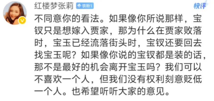 这番言论引爆舆论,张莉在微博反驳,称宝钗对宝玉有情义,并非争权夺利,她举剧中情节为例,贾府被抄,贾宝玉落魄,若宝钗是看重权势的“名媛”,此时大可离开,但她没有。张莉还表示,可以不喜欢一个人,但没权力贬低。红学专家指出,两人聊的不是一回事,欧阳奋强用现代流行语揣度封建少女,张莉捍卫的是剧版宝钗。