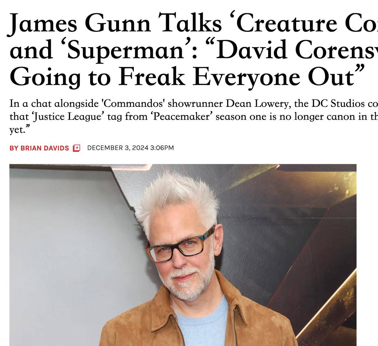 詹姆斯·古恩在采访中谈到了他对《生物突击队》和《超人》的期待,《THR》的影评人布鲁恩根据古恩的说辞,他分析了DC影业的计划与侧重点。布鲁恩预测《生物突击队》会得到资源,虽然这部电影不是反派系列,但是该片拥有《X特遣队》的感觉,此类作品相当受欢迎。扎斯拉夫时代的华纳注重票房,他们肯定不会放过赚钱的IP,《生物突击队》拥有这方面的潜质,该片当然能够得到资源。而且DC工作室根据市场的行情制定资源的分配规则,《生物突击队》的商业价值看上去比较高,此类作品还会得到资源。在宣传方面,布鲁恩预测华纳也会侧重于这部系列的受众群体,有些观众也会产生喜新厌旧的情绪。