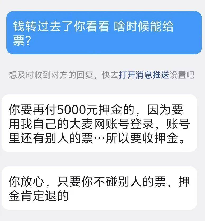“你稍等一下,还不能登录。”对方突然叫停,“我那个大麦账号里不只有你的票,还有好几个客户的票都在包里。我怕你登录进去不小心乱动,把别人的票搞没了。这样, 你再付5000元押金,保证不动账号里的东西,等你们看完演出,押金原路退回。”