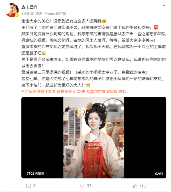 皮卡晨在『社交平台』发文感慨,离开待了七年的曲江满是不舍,同时感谢曲江给予的平台和支持。