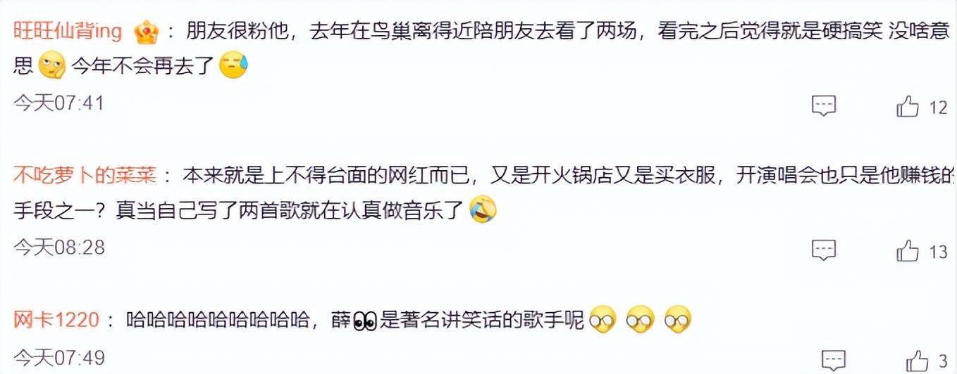 有网友反映他的演唱会段子太多,感觉全是段子,没什么用心的作品,根本撑不起一场演唱会,体验感自然不如那些用心做演唱会的演员了。