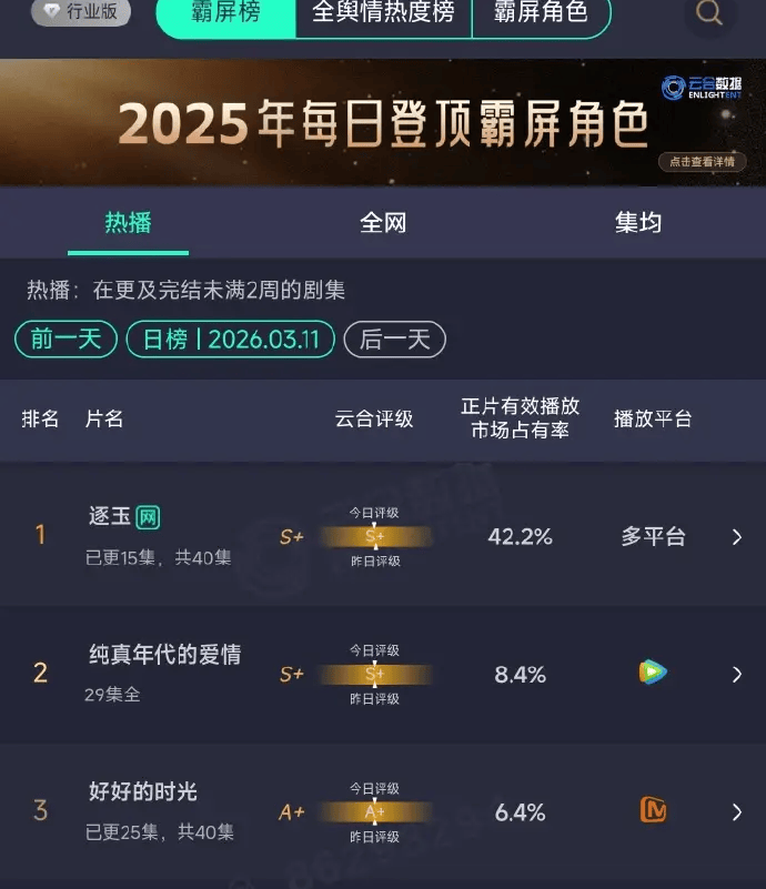 《逐玉》的战报显示:开播次日云合市占率达31.4%,开播第5天,云合市占率攀升至42.2%,位列历史第6位,单日播放量破亿。