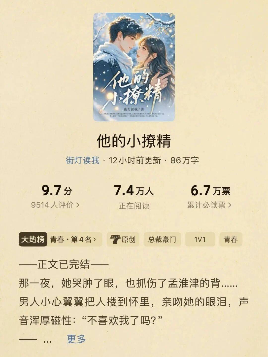 原著《他的小撩精》在七猫站内一度高居大热榜青春类榜首,9.7 分超高评分,同时文中的每一个人设都具备成长性与高光时刻,叙事节奏契合短剧特性的同时,在人物的二次塑造上也有了更大的空间。