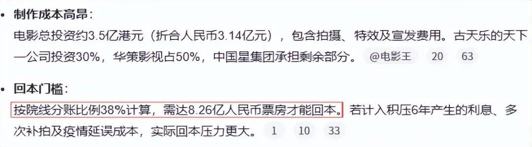 如果按照网传3.5亿港元的成本来算,起码需要8.26亿人民币票房才能回本,这么一算,片方是真的亏麻了。