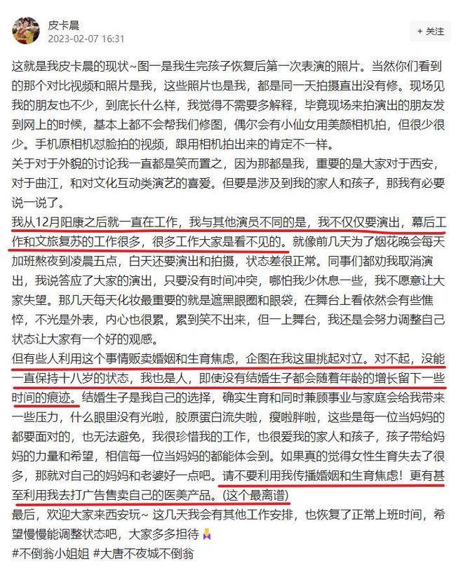 一些网友将皮卡晨三年前的照片与近期照片进行对比,指出她生育后由于胶原蛋白流失,显得老态,许多网友因此开始表示不敢结婚生子。对此,皮卡晨在『社交平台』上发布了自己的一张近照,并回应了生娃后面容憔悴的说法。她解释说,自己最近因为工作压力大,有时加班到凌晨五点,白天还要继续演出和拍摄,所以状态差是很正常的。但她强调,有些人却利用这个话题来贩卖婚姻和生育焦虑,甚至借此推广医美产品。皮卡晨表示,结婚和生育是她的个人选择,她不希望自己的经历被用来传播这些焦虑。评论我的外貌,我不在乎,每个人都有评论的权利,但我不愿意成为那些别有用心的人利用的工具。她在评论区写道,自己并不想被当作婚姻和生育焦虑的代言人,孩子快两岁了,这个锅我不背。