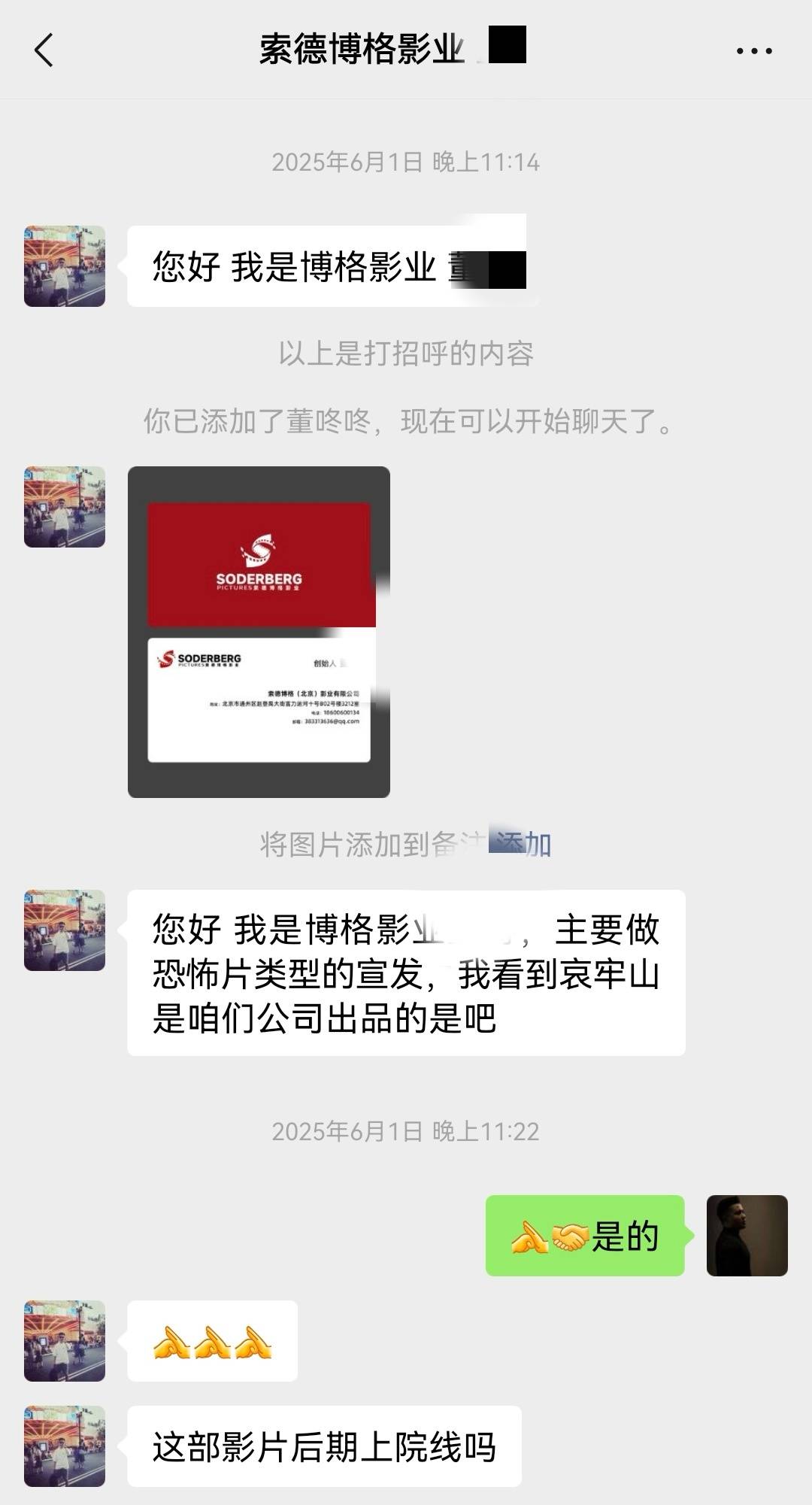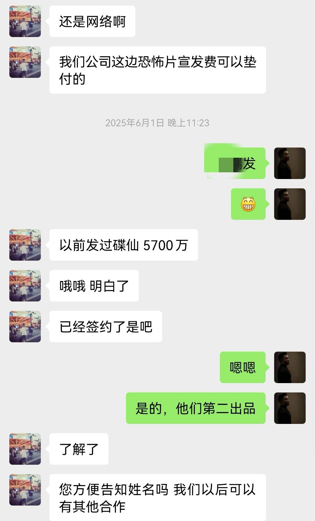 赵浙秋接受九派新闻采访时说,“我们做哀牢山火了以后,他们发行人联系到我想合作。但我们这边有合作方在谈,就没有跟他推进。”据其提供的聊天记录,《哀牢山》出品方之一索德博格影业有限公司曾于2025年6月主动联系赵浙秋,询问“影片后期上院线吗?”并主动寻求合作称“我们公司这边恐怖片宣发费可以垫付。”赵浙秋表示已经签约了。