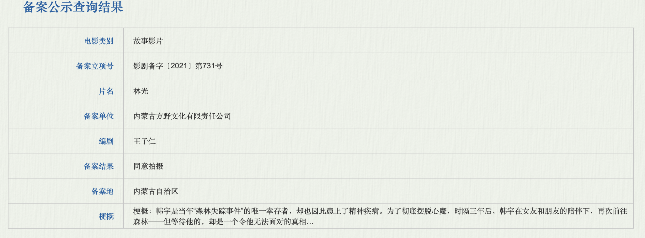 记者查阅发现,随着电影《哀牢山》两次更名,其故事梗概也有所改变。据国家电影局备案公示信息,电影《林光》,备案立项号影剧备字〔2021〕第731号,备案单位为内蒙古方野文化有限责任公司,编剧王子仁,备案地为内蒙古自治区。故事梗概为:韩宇是当年“森林失踪事件”的唯一幸存者,却也因此患上了精神疾病。为了彻底摆脱心魔,时隔三年后,韩宇在女友和朋友的陪伴下,再次前往森林——但等待他的,却是一个令他无法面对的真相…