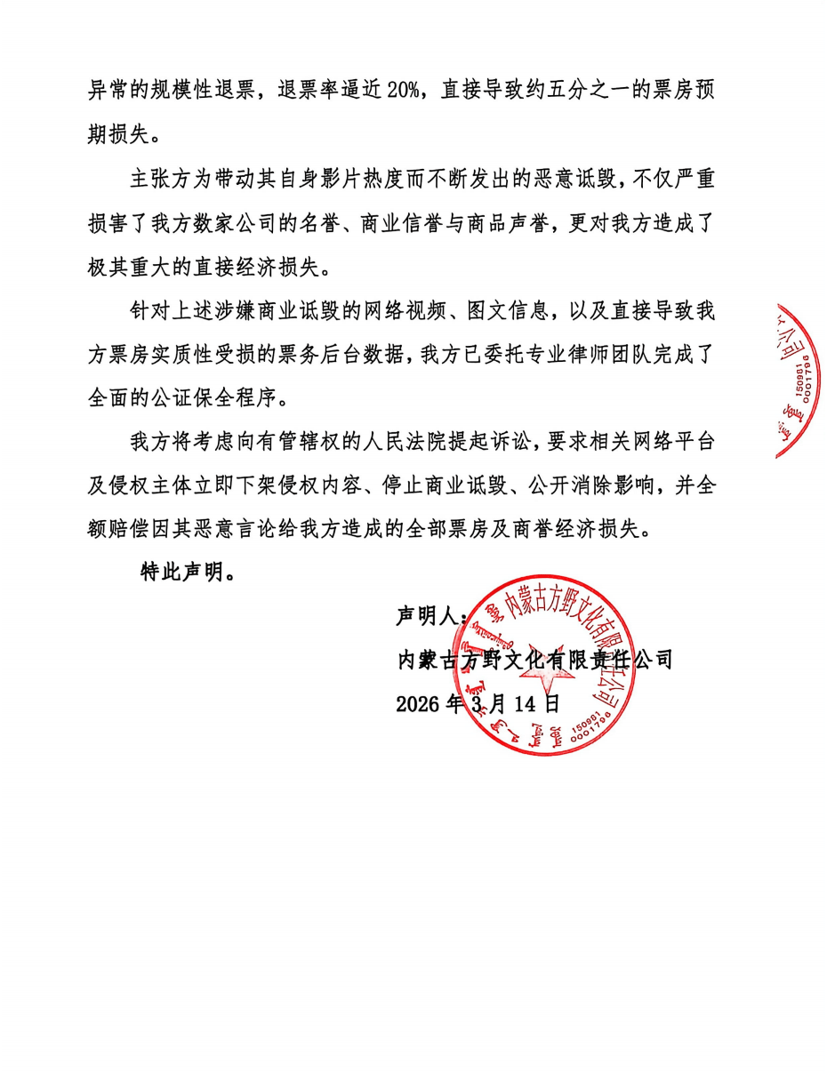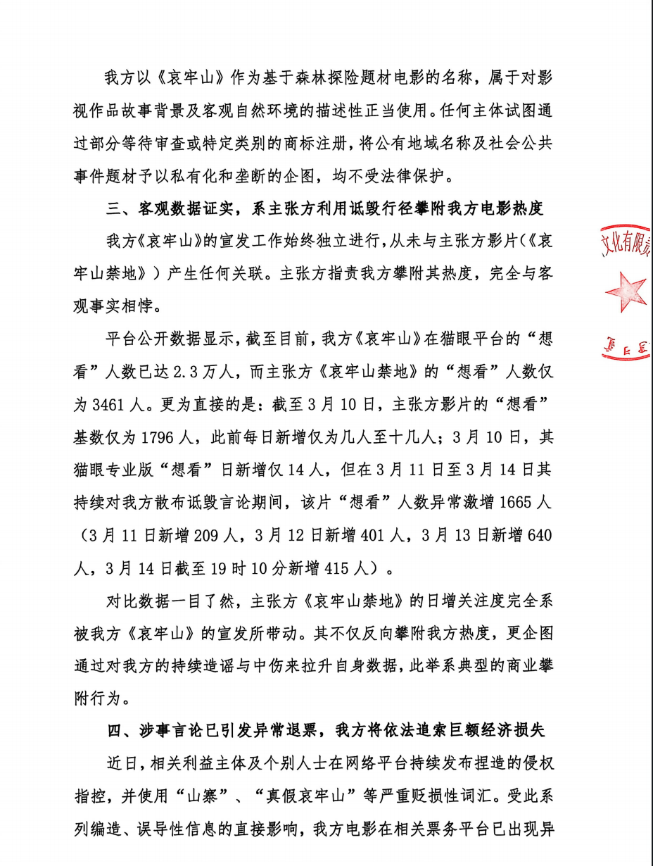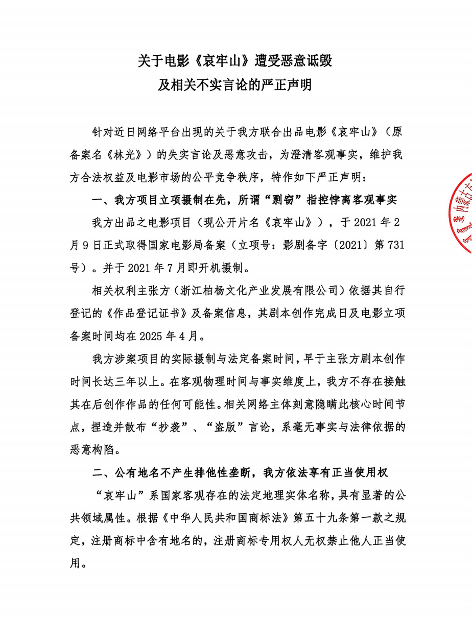 声明提出三点反驳:第一,我方项目立项制在先,所谓“剽窃”指控悖离客观事实;第二,公有地名不产生排他性垄断,我方依法享有正当使用权;第三,客观数据证实,系主张方利用诋毁行径攀附我方电影热度;第四,涉事言论已引发异常退票,我方将依法追索巨额经济损失。