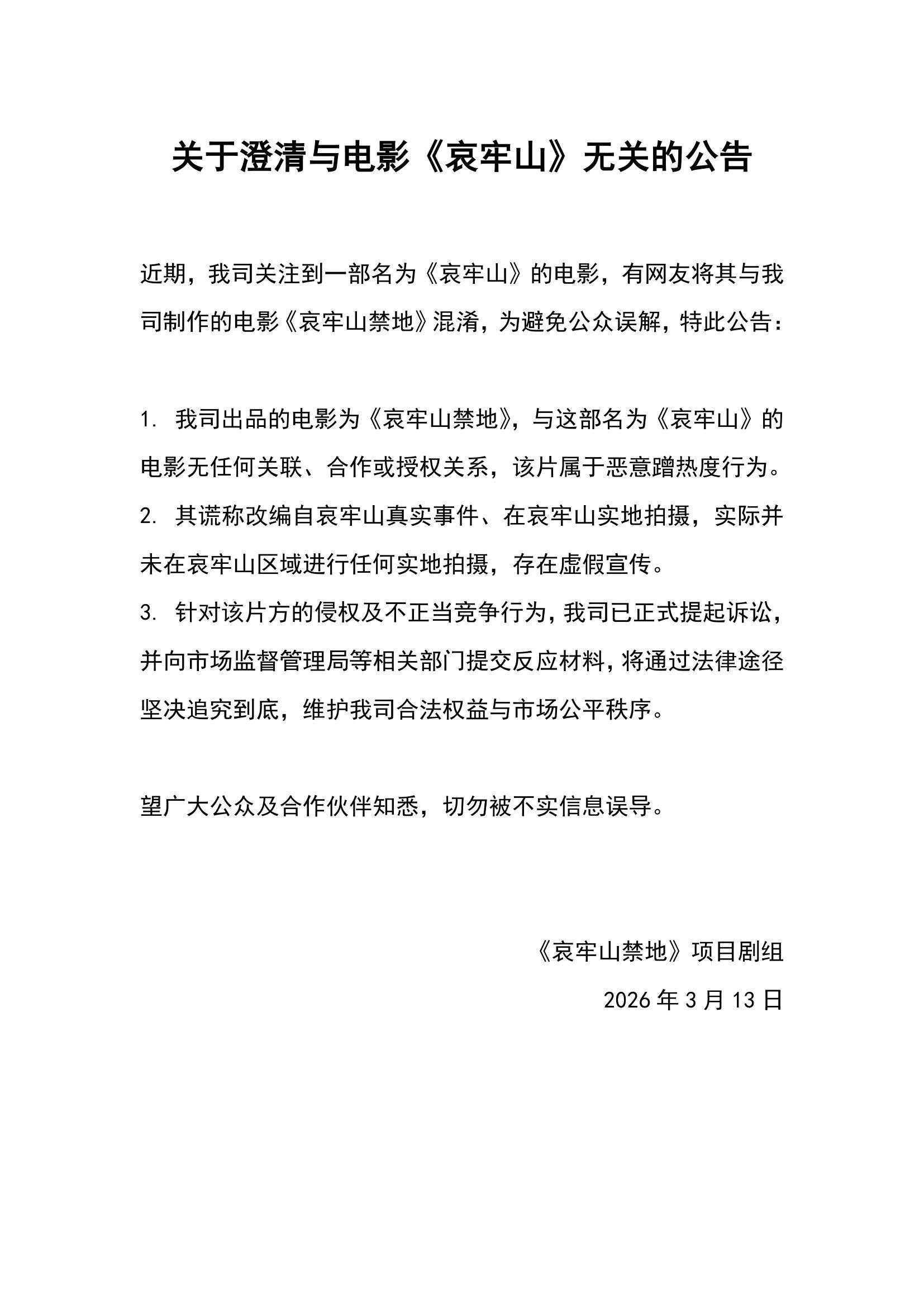 针对该片方的侵权及不正当竞争行为,《哀牢山禁地》剧组称已正式提起诉讼,并向市场监督管理局等相关部门提交反映材料,将通过法律途径坚决追究到底,维护我司合法权益与市场公平秩序。