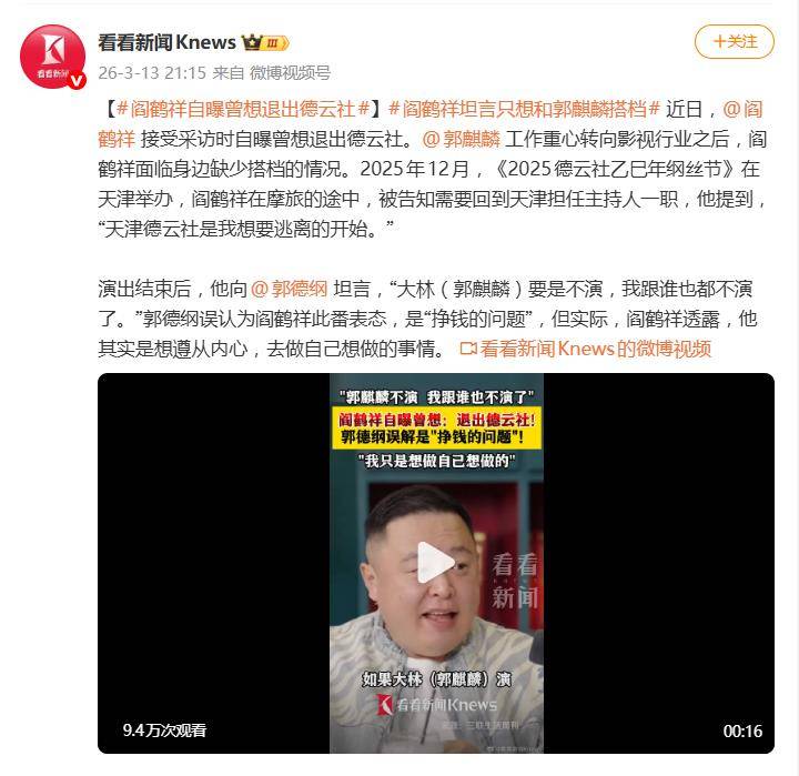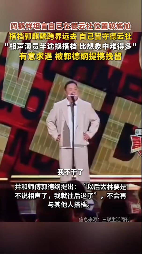据3月13日报道,最近,『德云社』阎鹤祥的一番坦白,直接揭开了相声搭档“单飞”后留下的职业困局。他在采访中自曝,曾因搭档郭麒麟长期投身影视而面临“相声失业”,甚至一度想退出『德云社』,一句“大林要是不演,我跟谁也不演了”的表态,还被师父『郭德纲』误会是“挣钱的问题”,瞬间在曲艺圈和粉丝中炸开了锅。