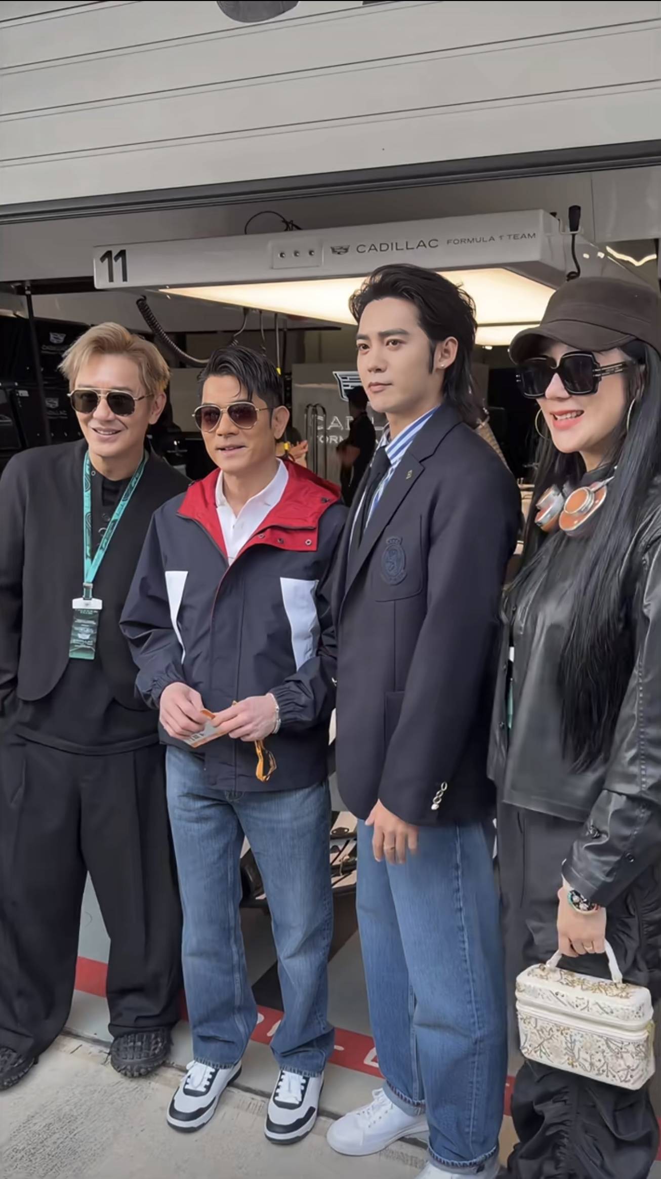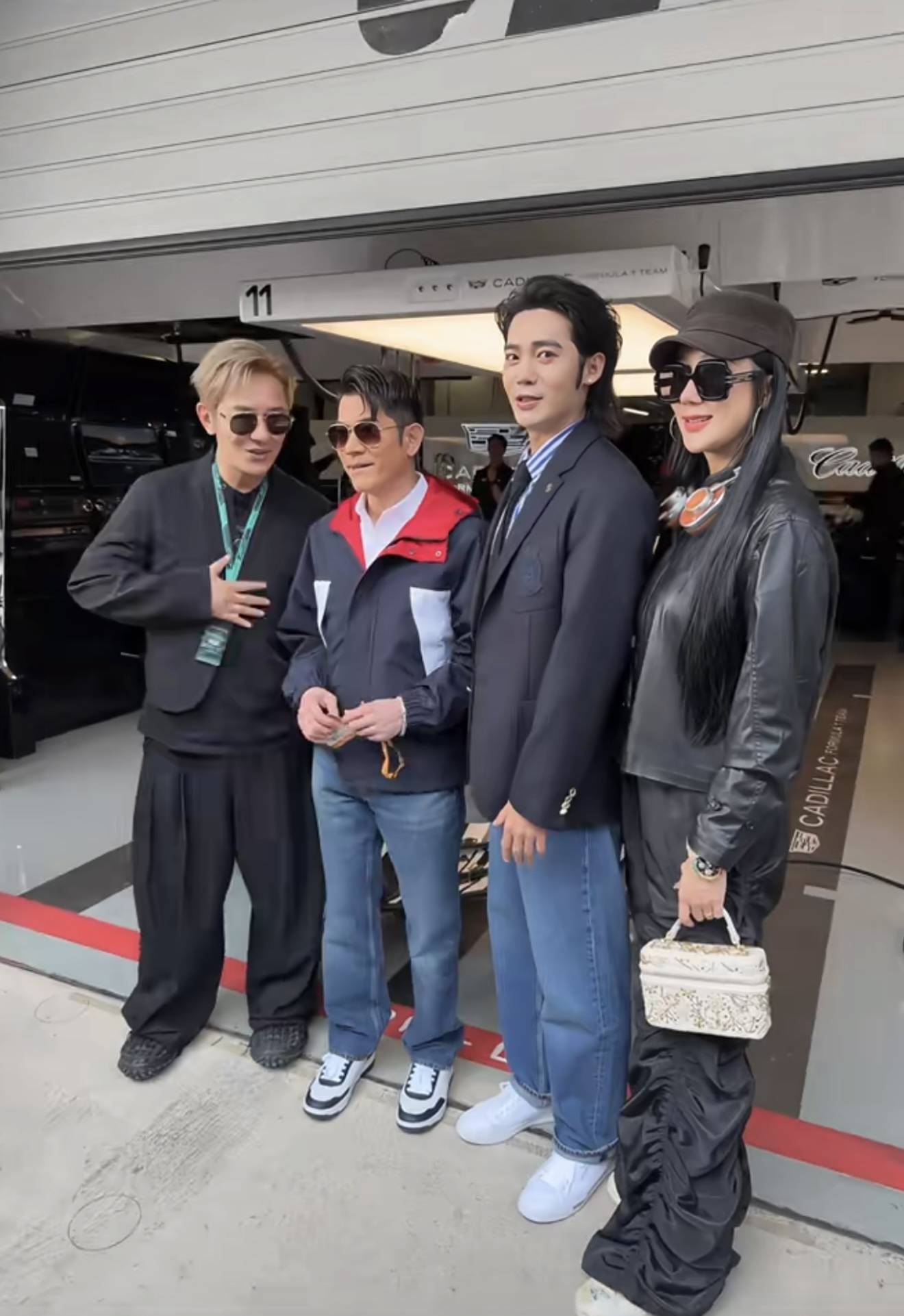 3月15日,『郭富城』、『于适』和陈浩民、蒋丽莎夫妇在上海f1赛车P房门前摆拍合影。