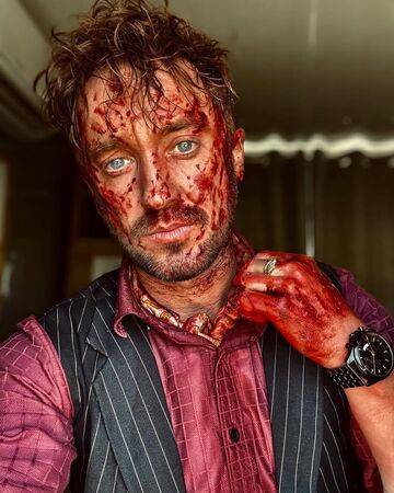 汤姆费尔顿近期在社群发布幕后照,全身浴血模样吓坏粉丝。(图/华纳提供)