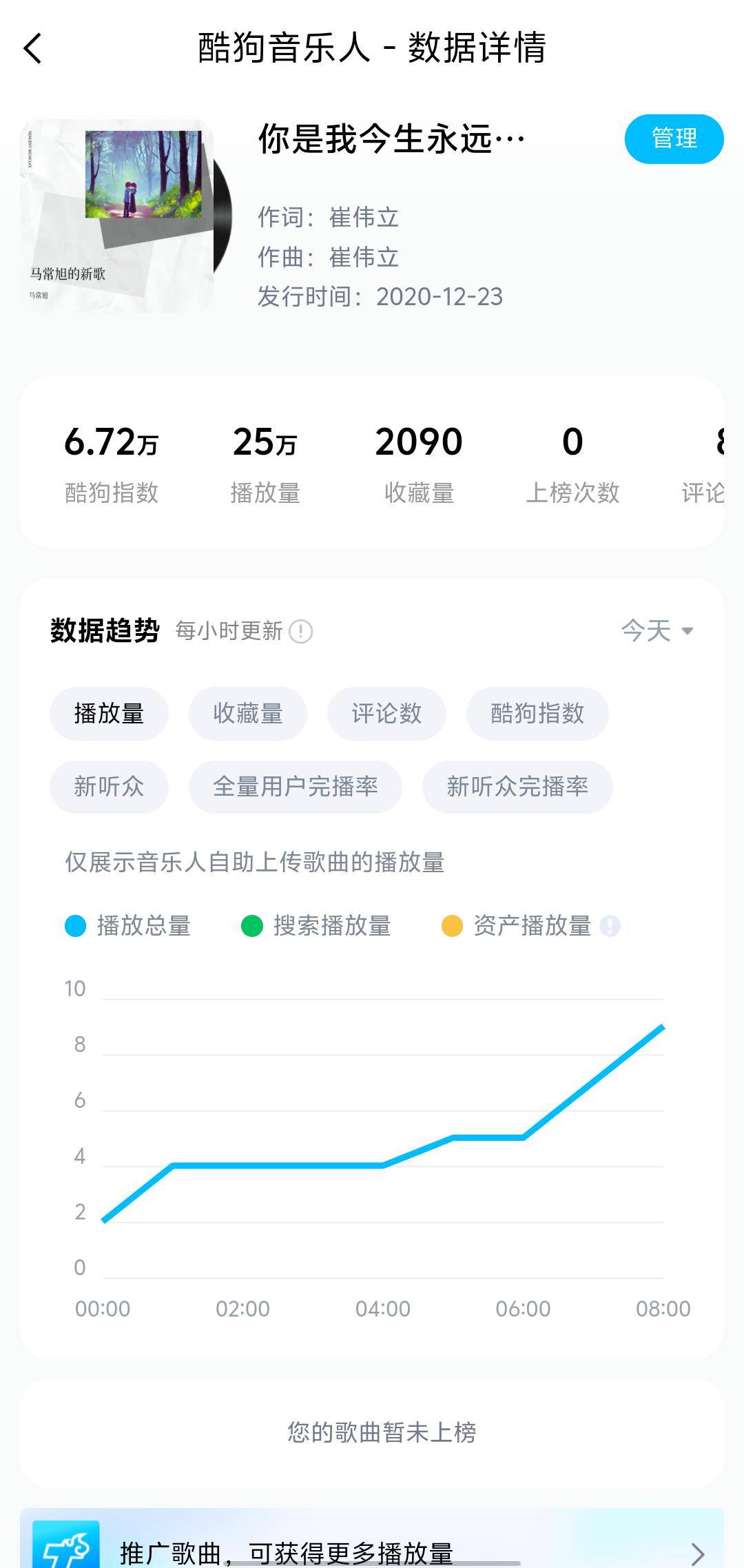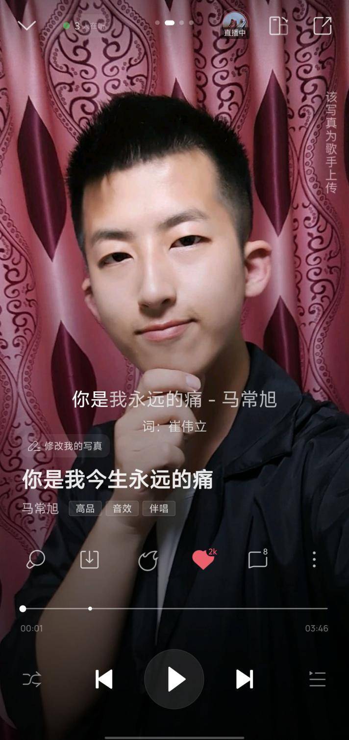 酷狗音乐数据显示,马常旭单曲《你是我今生永远的痛》播放量达25万次,收藏量超2000,印证其音乐受欢迎程度及业界认可。