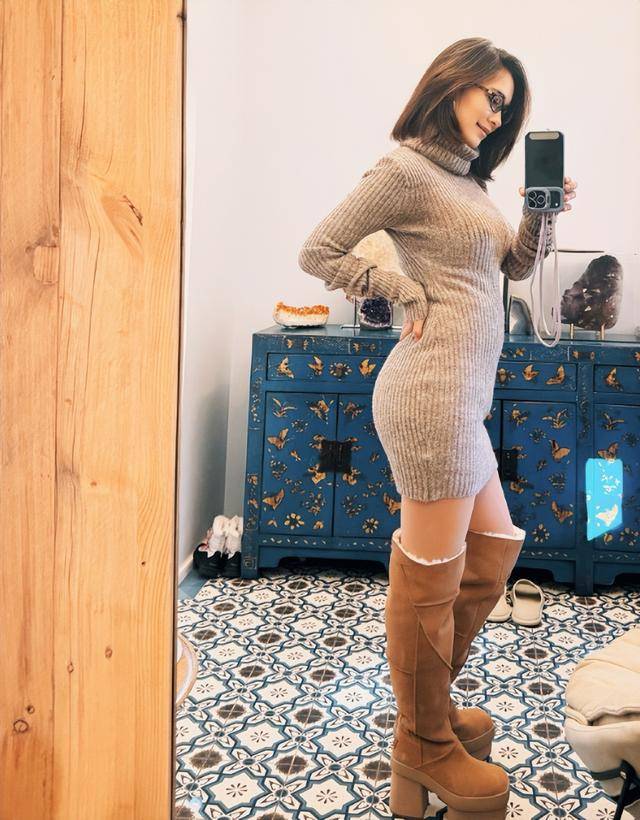 照片里的她染着一头金黄色头发,戴着黑框眼镜👓,身穿燕麦色高领紧身毛衣裙搭配棕色长筒靴,侧身对着镜子自拍🤳时,S形曲线一目了然。