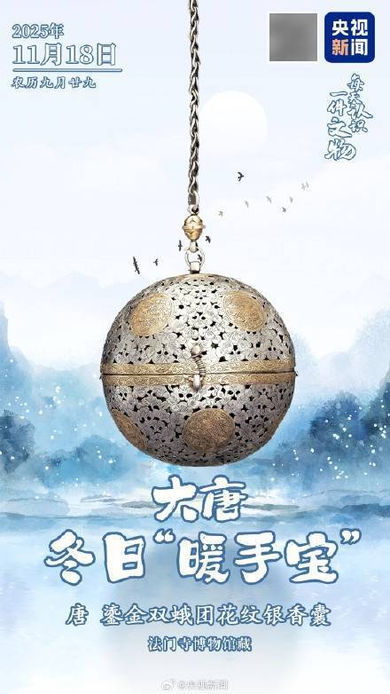 鎏金双蛾团花纹银香囊,呈圆球形,通体为镂空的阔叶纹样,部分纹饰鎏金。将香料放置其中,无论悬挂、手捧还是随身携带,里面的香料都不会洒,不仅能熏香,还可以当“暖手宝”。小小一枚香囊里,藏着“持平环”,这一设计完全符合陀螺仪原理,与现代航空、航海导航系统一脉相承。