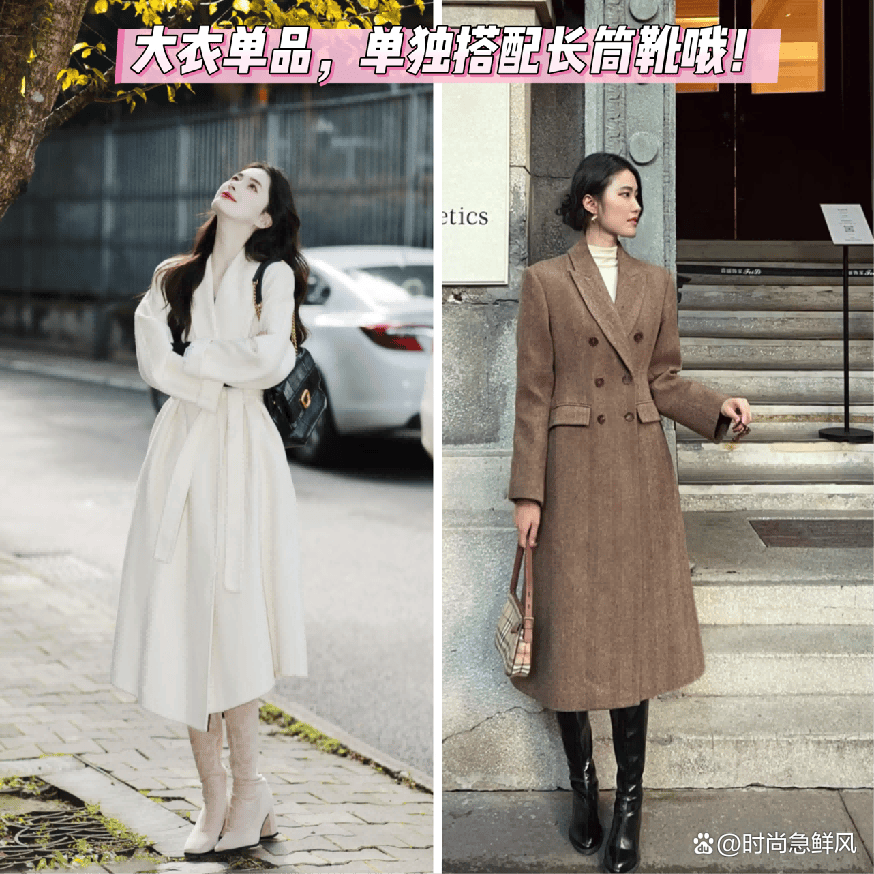 ➊ 大衣单独搭配+长筒靴,时髦衬身材