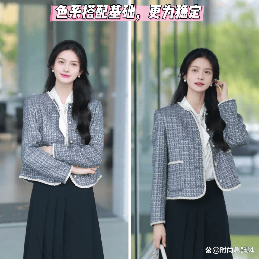 小香风的外套🧥,如果想要省事还想要穿的具有身材的稳定度,以及整体的高级和利落感的话,那么大家在最初选择进行入手的时候,最好就可以直接运用套装上身,非常省事。而且绝大多数的小香风套装都是属于版型的状态比较稳定,轮廓的走向非常明朗,能够优化身材上的不足,且能够衬托出来流畅利落的视觉效应等。