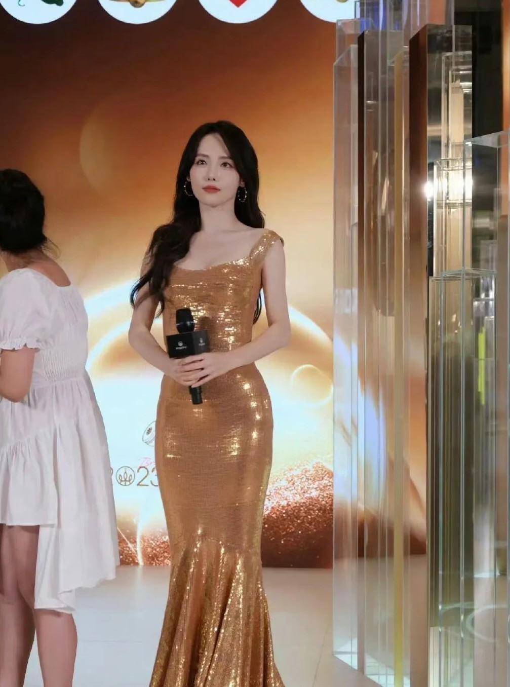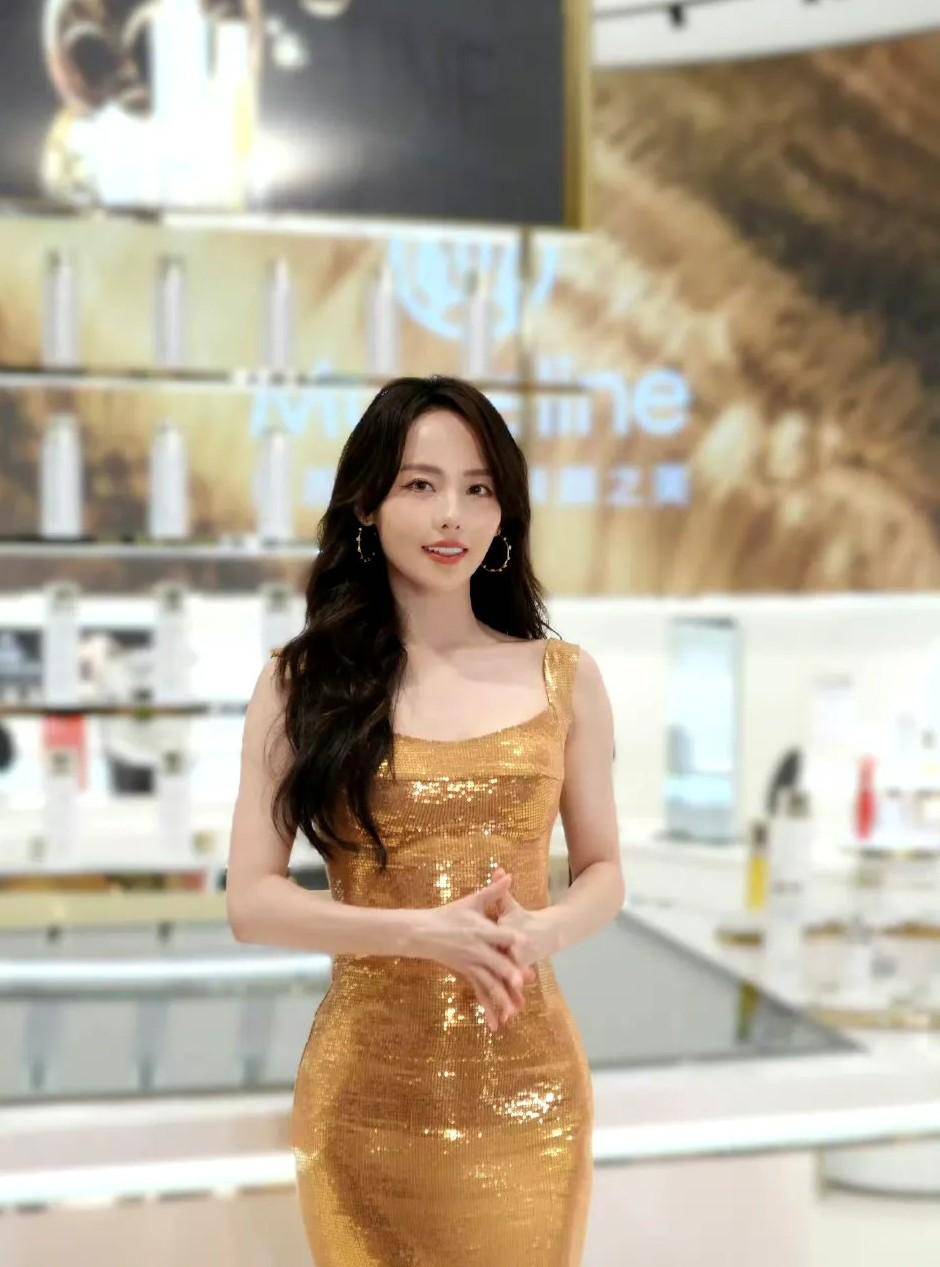 『张嘉倪』这身金色亮片吊带裙一亮相,就把 “性感精灵” 的标签焊在了审美点上。裙身采用body-con 剪裁,从方领肩带处便开始贴合曲线,到腰腹位置骤然收窄,再顺着臀线自然舒展,像量身定制的鎏金容器,把她 X 型身材的优势裹得恰到好处。亮片在灯光下折射出细碎光泽,随着她抬手的动作,腰侧的凹陷与胯部的弧度形成精准的视觉落差,0.7 的腰臀比像被标尺量过般标准,连裙摆垂坠的褶皱都在强调这份凹凸感。