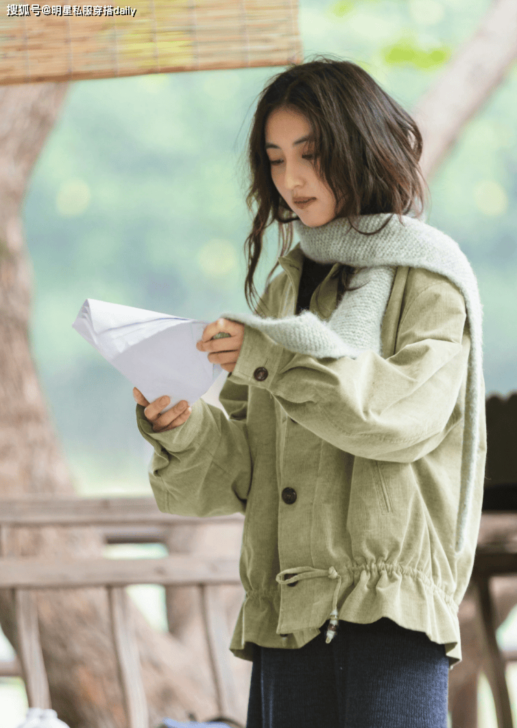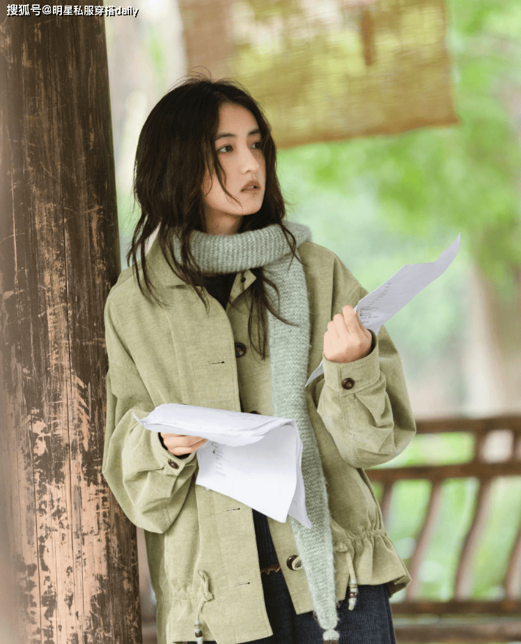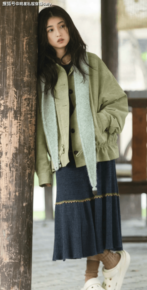 绿色夹克+针织半身裙『张子枫』身上的文艺气息太吸引人了,她喜欢低饱和度的服饰,比如低饱和度的绿色,搭配一条同色系不同深浅的绿色针织围巾🧣,显白的同时,层次感十足,搭配高腰针织半身裙,文艺又有范儿!